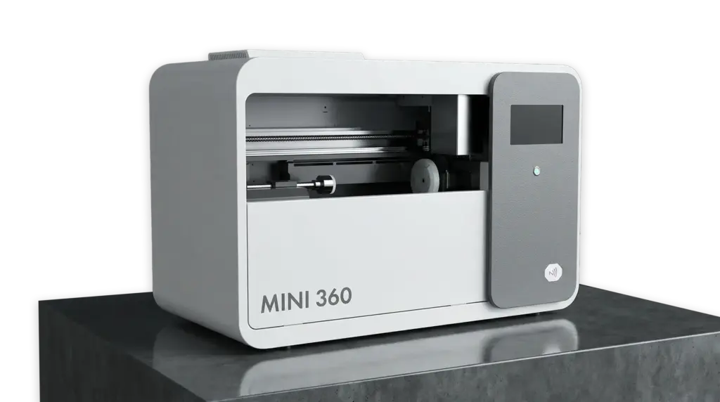 MINI 360 es una impresora UV LED compacta para la personalización directa de objetos cilíndricos y ligeramente cónicos, ideal para aplicaciones promocionales, artesanales y de pequeña producción